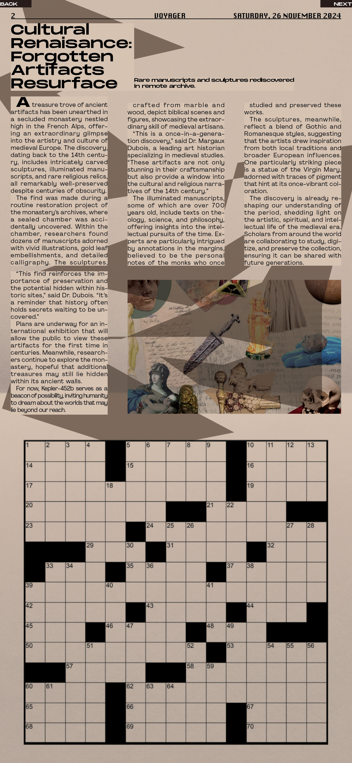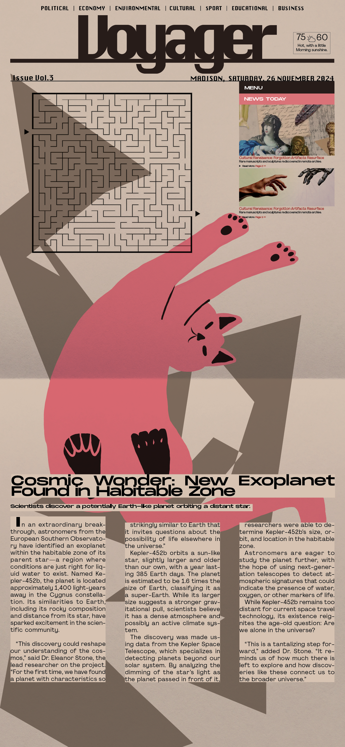 For my class project in Art 346: Basic Graphic Design, titled "Voyager," I explored the grid system in both print and digital formats. The assignment required me to create a printed broadsheet measuring 29.5" x 23.5" using InDesign, where I integrated multi-column layouts, typography, and imagery.