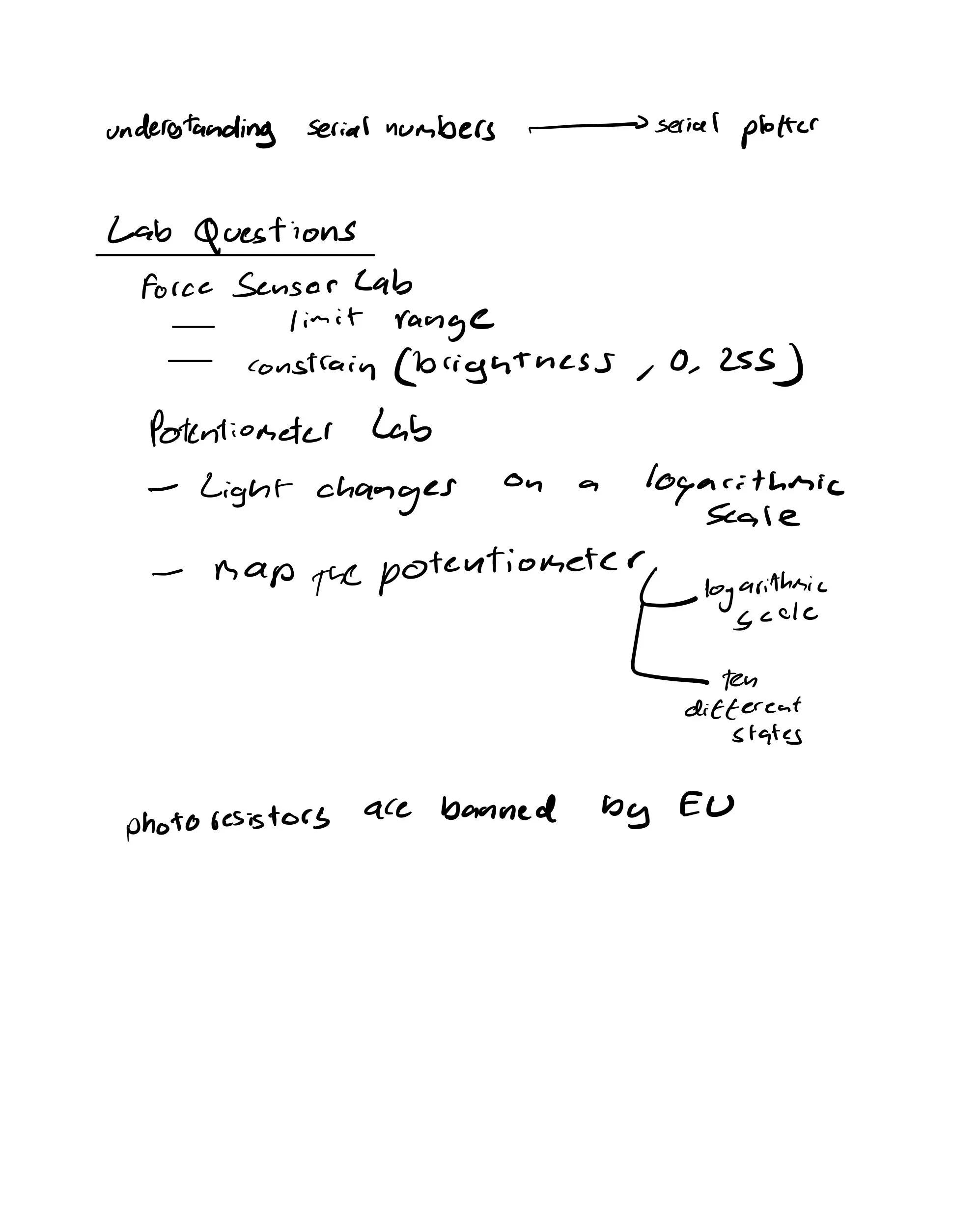 I had questions about the potentiometer lab. I was wondering if the potentiometer was working correctly. The potentiometer wasn't dimming as well as I thought. Then I learnt that the potentiometer changes the light on a logarithmic scale, so that we could map the potentiometer to a logarithmic scale or ten different states. Hence, it dims more smoothly. In class, Arjun asked how many LEDs might be marked on various states, and it made me think that that's such a tedious process. There must be a more efficient method.